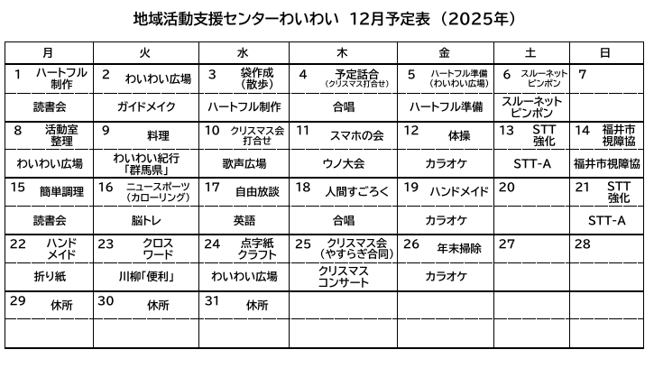 12月のわいわい活動予定です。(午前 10時~12時 午後 13時~15時)