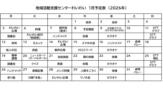 1月のわいわい活動予定です。(午前 10時~12時 午後 13時~15時)