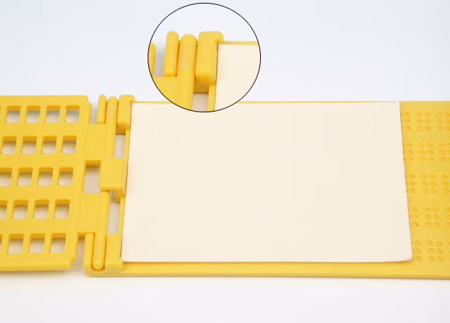 「持ち運びしやすい大きさで、なるべく点字のマス数を多く書ける点字器」をコンセプトに、点字器の上下左右の端ギリギリまで、可能な限り点字のマスを設置し、余白はなるべく小さくしてあります。