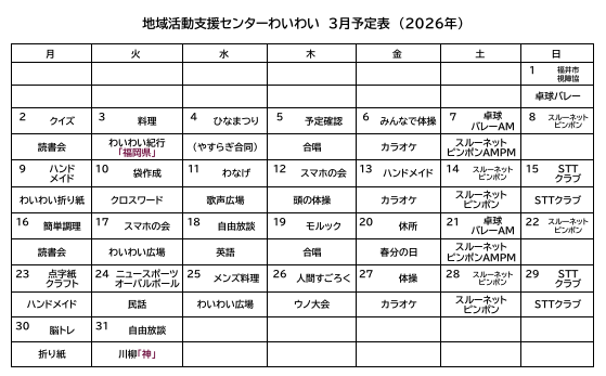 3月のわいわい活動予定です。(午前 10時~12時 午後 13時~15時)